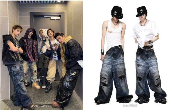 Cụ thể, Seonghyeon diện mẫu quần SIP & SPILL baggy jeans với hiệu ứng chuyển màu tinh tế, mang lại cảm giác cũ kỹ, “bụi bặm” đầy nghệ thuật. Trong khi đó, Juhoon lại chọn thiết kế CRISIS CRAVER jeans với những chi tiết mài rách cá tính. Điểm thú vị trong bản phối này chính là cách stylist của nhóm gợi ý việc nhét ống quần baggy rộng vào trong giày bốt, tạo nên một cấu trúc trang phục vừa gọn gàng, vừa phá cách, giúp đôi chân trông dài hơn và tăng thêm phần quyền lực trên sân khấu.