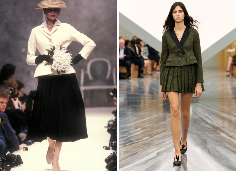 Một trong những thủ pháp rõ rệt nhất mà Anderson áp dụng là thay đổi tỉ lệ. Chiếc Bar Jacket kinh điển – vốn được xem như hiện thân của “New Look” với vai tròn, eo thắt và phần hông nở – lần này lại được “shrunken”, làm nhỏ đi, khiến nó trở nên gọn gàng, trẻ trung hơn. Phần peplum không còn xoè đúng chuẩn như xưa, mà được đẩy cao về phía ngực, tạo cảm giác hourglass lạ lẫm, như một bản phác họa méo mó đầy chủ đích. Song song đó, Anderson thử nghiệm với những chiếc mini skirt có phần chân váy phồng bè ra phía sau, hay các silhouette “double balloon” gợi nhớ pannier trong phục trang thế kỷ 18, nhưng được tiết chế để phù hợp với nhịp sống hiện đại. Đây là cách anh “bẻ cong” quá khứ, không phải để phá vỡ, mà để làm cho nó trở nên mới mẻ, khó đoán định hơn.
