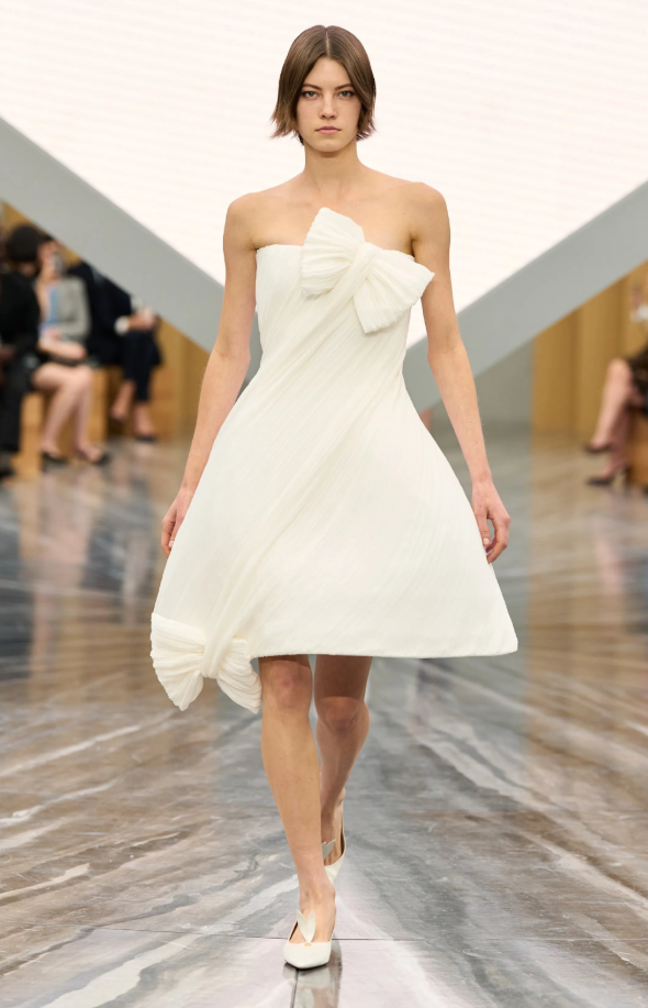 Ngay từ những look đầu tiên, Anderson đã cho thấy mình không có ý định tách Dior ra khỏi quá khứ, mà ngược lại, anh vẫn giữ những bản sắc ban đầu. Các biểu tượng như Bar Jacket, chiếc váy Junon từ năm 1949, các chi tiết draping, corset, nơ lớn… lần lượt xuất hiện, nhưng không mang dáng dấp của sự sao chép. Thay vào đó, chúng được “giải mã”, “tháo rời” rồi lắp ghép lại bằng một ngôn ngữ mới. Anderson hiểu rõ: muốn đưa Dior đi xa hơn, cần khởi đầu bằng việc chứng minh rằng mình am hiểu DNA của nhà mốt. Chính vì thế, phần lớn thiết kế đều mang tinh thần “tôn vinh trong tái tạo” – giống như một lời tri ân đến Christian Dior nhưng đồng thời khẳng định tư duy sáng tạo hiện đại.