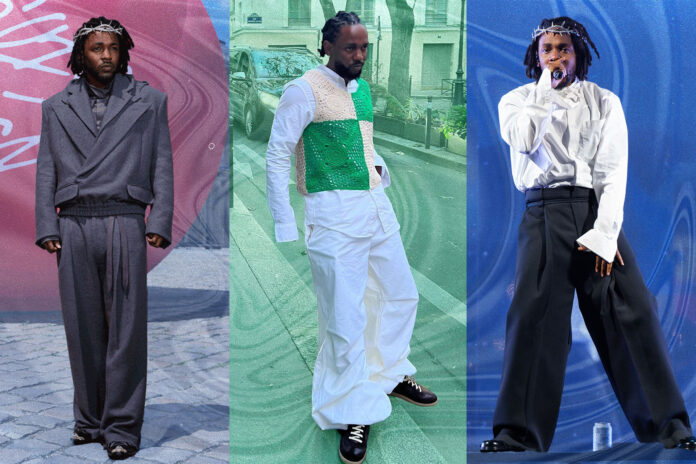 Bám sát xu hướng thịnh hành bằng những outfit với form rộng vừa và thoải mái, Kendrick Lamar sử dụng những chiếc quần ống suông, ống loe và quần tây may theo kiểu truyền thống phối cùng áo blazer độn vai, dáng rộng. Tổng thể trang phục của nam rapper như được nâng cấp một cách “xa xỉ”.