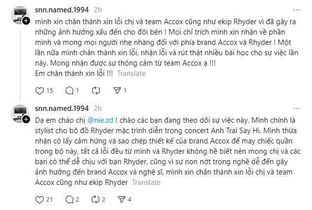 Sau một ngày đăng tải, stylist trong câu chuyện ồn ào cũng đã chính thức lộ diện với bài đăng và bình luận xin lỗi tích cực dưới bài tố. Người này thừa nhận mình đã lấy cảm hứng và sao chép thiết kế của ACCOX để may lại chiếc quần của Rhyder. Đồng thời, stylist cũng nhận tất cả lỗi về mình, tiết lộ Rhyder không hề biết mọi chuyện, mong mọi người có thể dễ chịu với nam ca sĩ hơn.