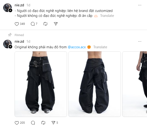 Tưởng chừng vấn đề trên chỉ xảy ra ở quốc tế, nhưng không đâu xa, tại Việt Nam cũng từng xảy ra một trường hợp tương tự. Vụ bê bối bùng phát ngay sau đêm concert “Anh Trai Say Hi” vào tháng 10.2024), Rhyder đã diện một outfit gồm một chiếc quần đỏ được thiết kế đặc biệt khi diễn bài “I’M THINKING ABOUT YOU”. Ngay sau đó, Nie D – đại diện ACCOX – đã đăng tải bài viết công khai, đưa ra so sánh chi tiết giữa mẫu quần của Rhyder và mẫu quần jeans đặc trưng của thương hiệu mình.