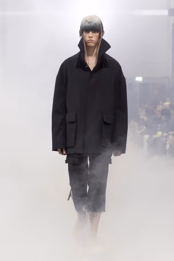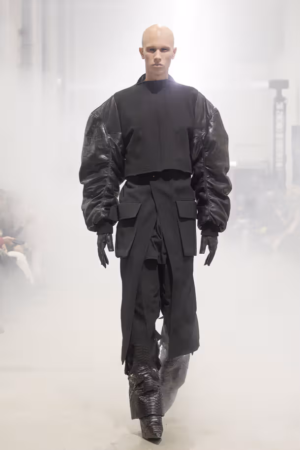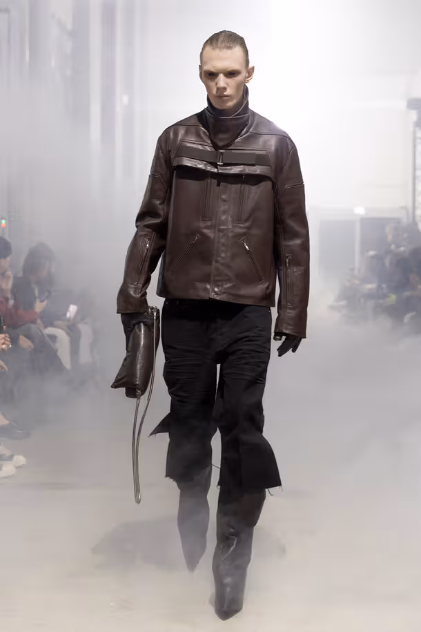 Bộ sưu tập tiếp tục khai thác triệt để những silhouettes mang đậm ảnh hưởng chủ nghĩa tàn bạo (Brutalism) vốn đã thành DNA của thương hiệu. Những đường cut-out bất đối xứng đặc trưng của Owens được đẩy lên một tầm cao mới với khả năng biến đổi linh hoạt. Những chiếc áo khoác mô-đun bằng da thuộc Nhật Bản có thể được bóc tách lớp ngoài để lộ ra những chiếc vest dài bên trong, tạo nên một sự phân lớp layer đầy chiều sâu kiến trúc. Sự tương tác giữa cơ thể và trang phục không còn là sự gò bó, mà là một cuộc đối thoại giữa da thịt và những hình khối hình học khắc nghiệt, tạo nên một vẻ đẹp vừa gây cảm giác bị đe dọa vừa quyến rũ.