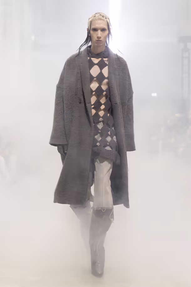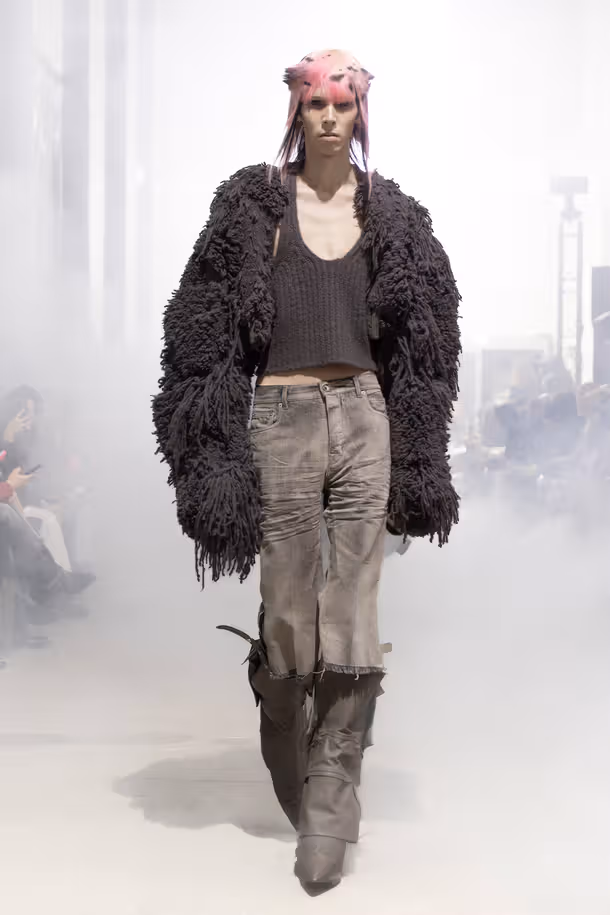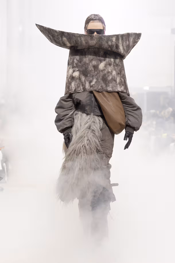 Điểm đặc biệt nhất chính là cách Rick Owens dùng những chất liệu “có độ bên cao” đại diện cho sự bảo vệ trong thông điệp của ông. Ông đưa sợi Kevlar loại vật liệu siêu bền dùng làm áo chống đạn vào các thiết kế áo khoác như một cách tạo ra “tấm khiên” bảo vệ tinh thần cho người mặc trước thế giới bên ngoài. Đi kèm với đó là chất liệu da bò thô đặc trưng từ Nhật Bản, mang vẻ ngoài hoang dã nhưng lại cực kỳ sang trọng. Tuy nhiên, để bộ sưu tập không bị khô cứng như những cỗ máy, ông đã khéo léo thêm vào những loại len dệt tay mềm mại từ vùng núi Himalaya và Ý. Sự đối lập giữa vẻ cứng cáp như áo giáp với sự ấm áp của len chính là thông điệp mà Rick muốn gửi gắm: dù cuộc sống có khắc nghiệt đến đâu, sự kết nối và hơi ấm giữa con người với nhau vẫn là điều quan trọng nhất.