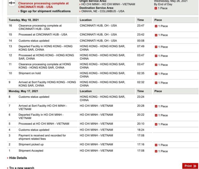 Sau khi được gửi sang Mỹ vào ngày 17 tháng 5 vừa rồi, thì đôi Air Jordan 1 “Chicago” 2015 đã đến nơi vào ngày 19 tháng 5, chỉ đúng 3 ngày. Như vậy dự đoán có thể đầu tuần sau giày sẽ được gửi bán lên GOAT và quy trình sẽ mất thêm khoảng hơn 1 tuần nữa để chúng ta có kết quả chính thức.