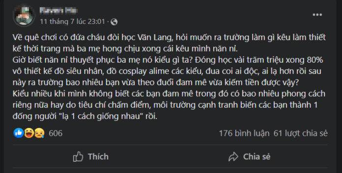 Cụ thể, anh chia sẻ: “Về quê chơi có đứa cháu đòi học Văn Lang, hỏi muốn ra trường làm gì kêu làm thiết kế thời trang mà ba mẹ hong chịu xong cái kêu mình năn nỉ.