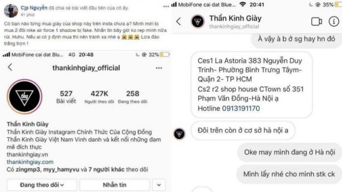 Vừa qua, có một tài khoản Facebook tên Cjp Nguyễn đăng bài tố cáo lên group vì bị trang Instagram thankinhgiay_official lừa đảo 2 đôi Air Force 1 Shadow. Đã có không ít anh em bị lừa ở shop giả mạo này vì mặc dù có nhiều bài phốt. Nhưng mặc nhiên shop bán giày fake này vẫn tồn tại.