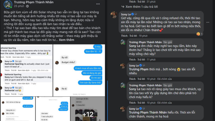 Theo thông tin bài viết, Thành Nhân và Sony là đôi bạn cùng tiến. Cũng vì thế mà Thành Nhân có nhờ Sony pick up 1 đôi Nike Yeezy Solar Red để bán cho khách. Đến khi Thành Nhân nhận giày thì vỡ lẽ ra giày hoàn toàn khác condition đã được báo nên yêu cầu refund cũng như làm rõ. Chỉ vài phút sau khi bài viết được đăng, phía Sony có biểu hiện ăn năn hối lỗi bằng cách xin lỗi qua comment trên bài viết. Cả bài viết và bình luận đều đã ra đi không một lời giải đáp, có thể cả Thành Nhân và Sony không muốn vì 1 đôi giày beat mà đánh mất tình bạn cao quý nên đã giải quyết nội bộ riêng, tránh vạch áo cho người xem lưng. Một lưu ý nhỏ là đôi giày Sony định bán cho Thành Nhân chính là nhân vật chính của chiếc kèo trăm triệu đang lùm xùm hơn 2 tuần qua.